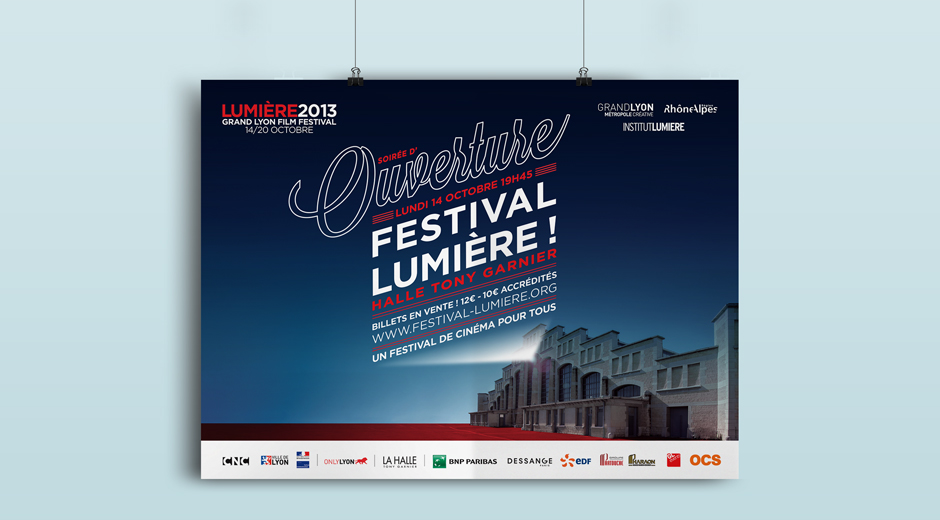Le visuel d'ouverture du Festival Lumière joue sur le gigantisme d'un cinéma éphémère et populaire. La Halle Tony Garnier, sertie entre tapis rouge et faisceau de projection,et baignée dans une teinte "nuit américaine" se transforme, comme marche après marche, en immense palais de cinéma.
