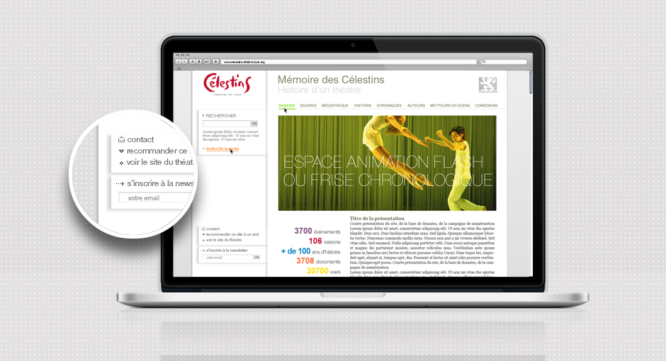 Le théâtre des Célestins, en partenariat avec la ville de Lyon et les Archives Municipales de Lyon lance une grande campagne de numérisation pour rendre accessible 5800 documents illustrant les spectacle présentés depuis 1899. Le site "Mémoire de Célestins" permet d'explorer l'histoire du théâtre, et de témoigner de la richesse du spectacle vivant en Rhône-Alpes.